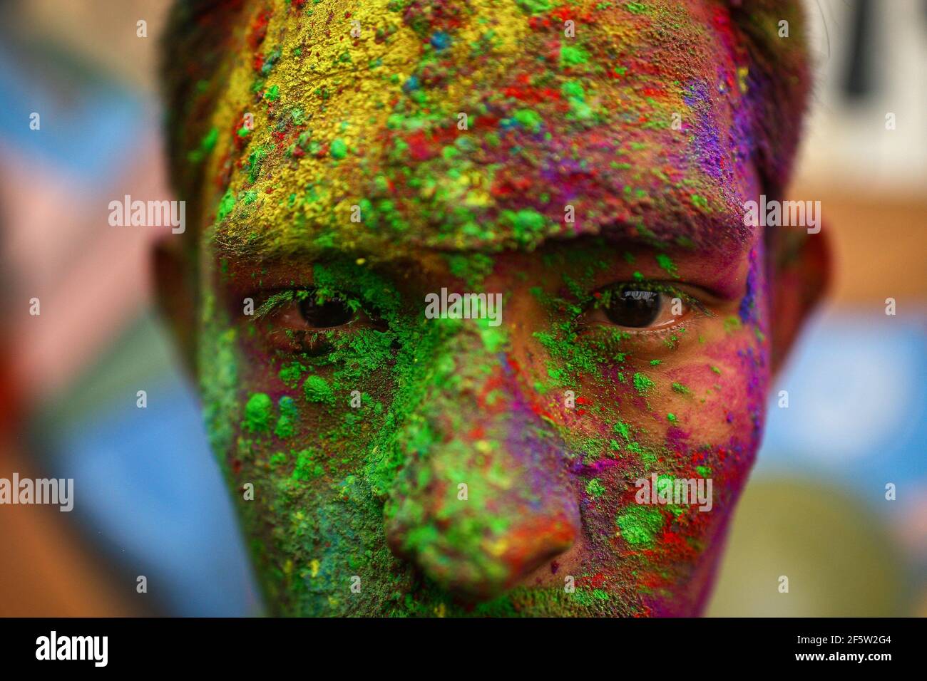 Face of a reveller smeared with colours as he celebrates Holi festival