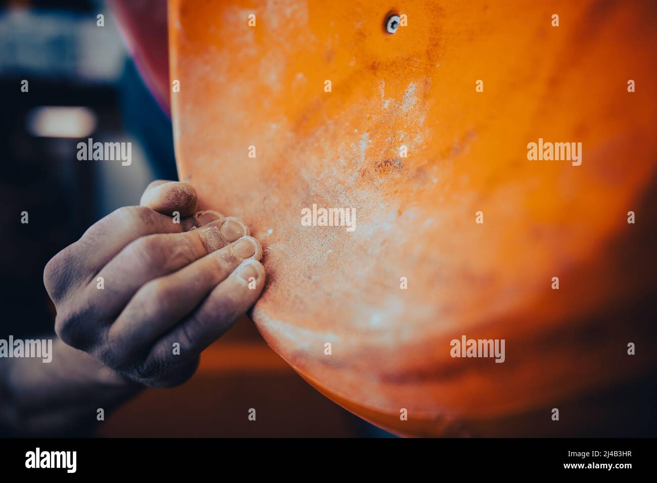 Close up shot of a male hand smeared with magnesium powder grabbing a