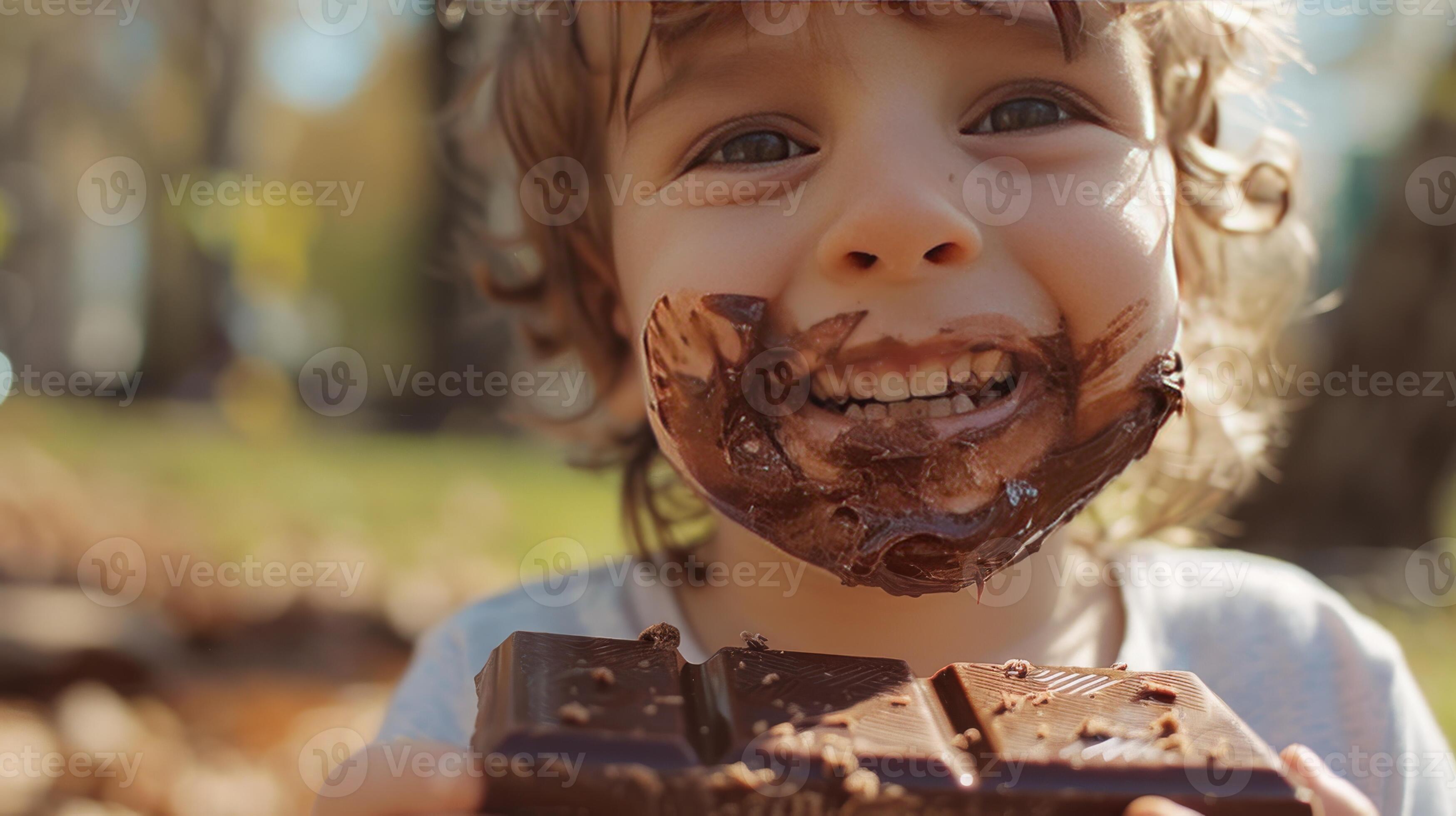 A child with chocolate smeared hands and face enjoying a chocolate bar