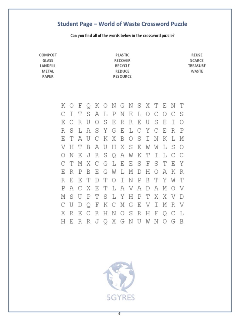 Student Page World of Waste Crossword Puzzle PDF Waste Natural