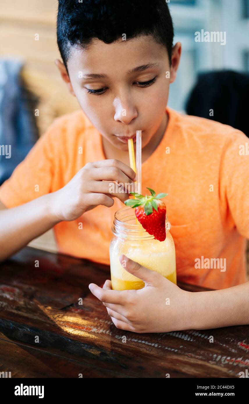Happy Boy Drinking Healthy Smoothie with Straw Enjoying and Smiling