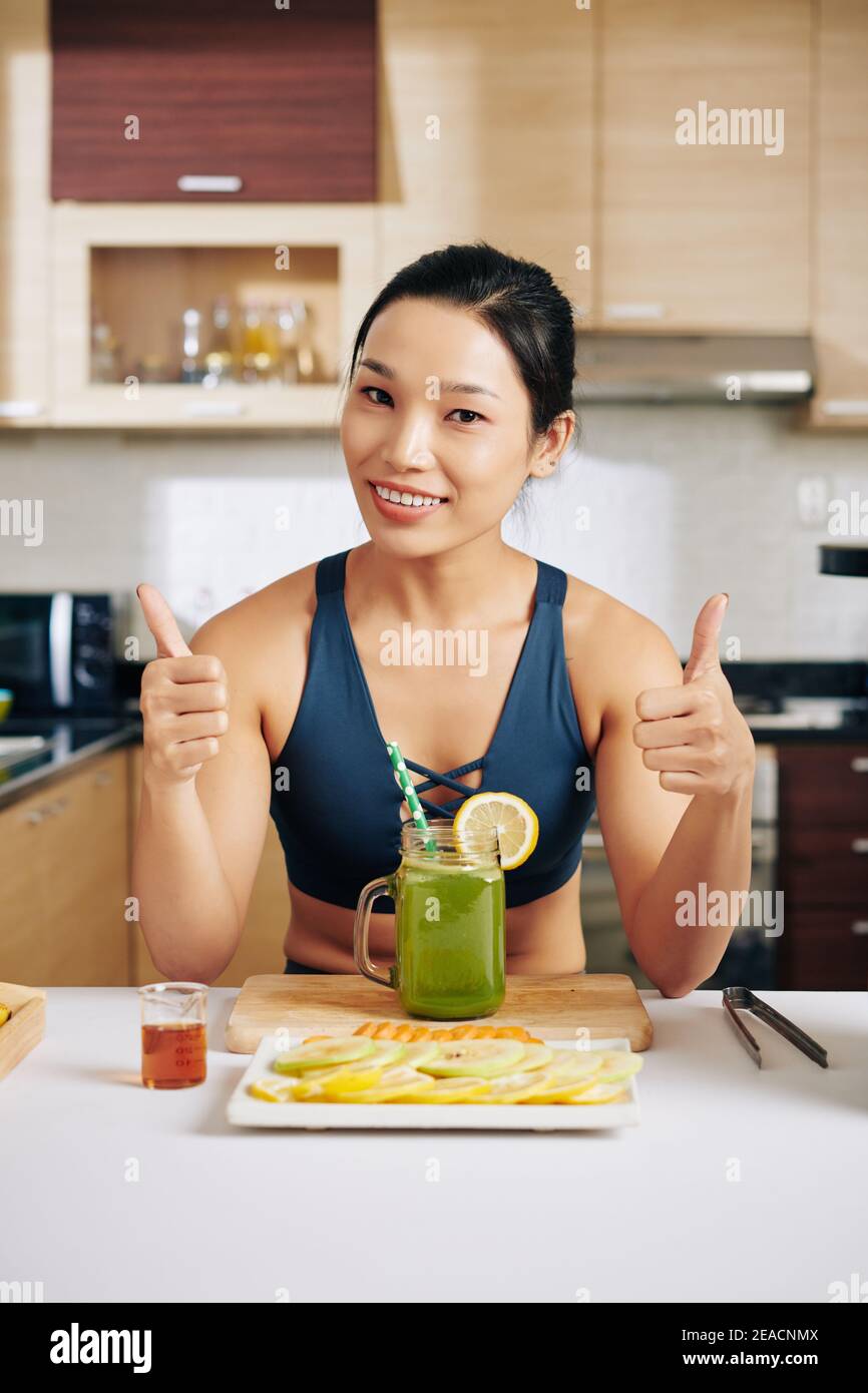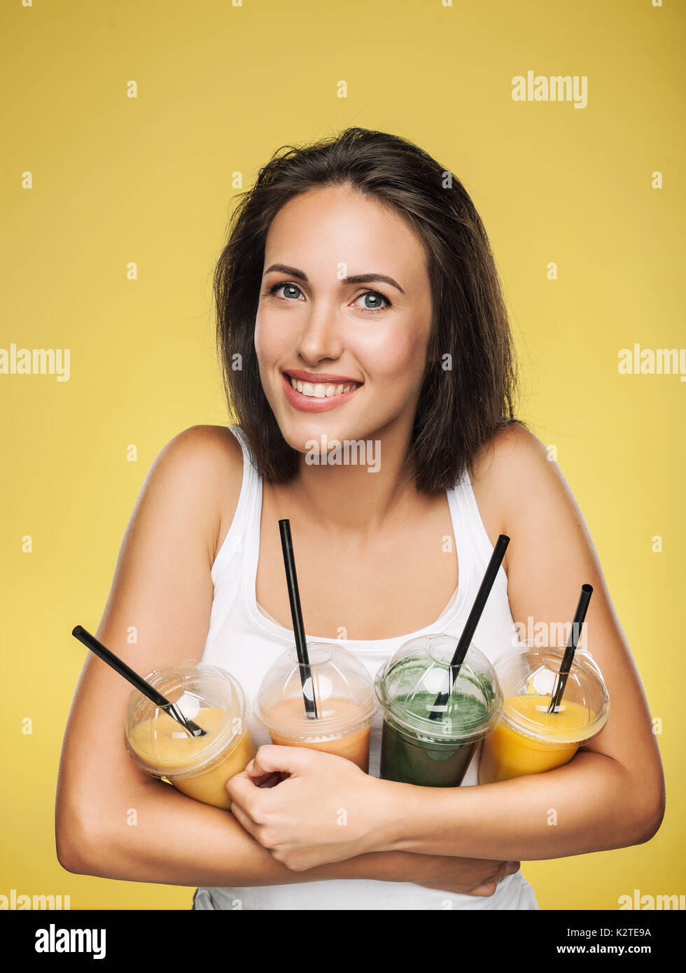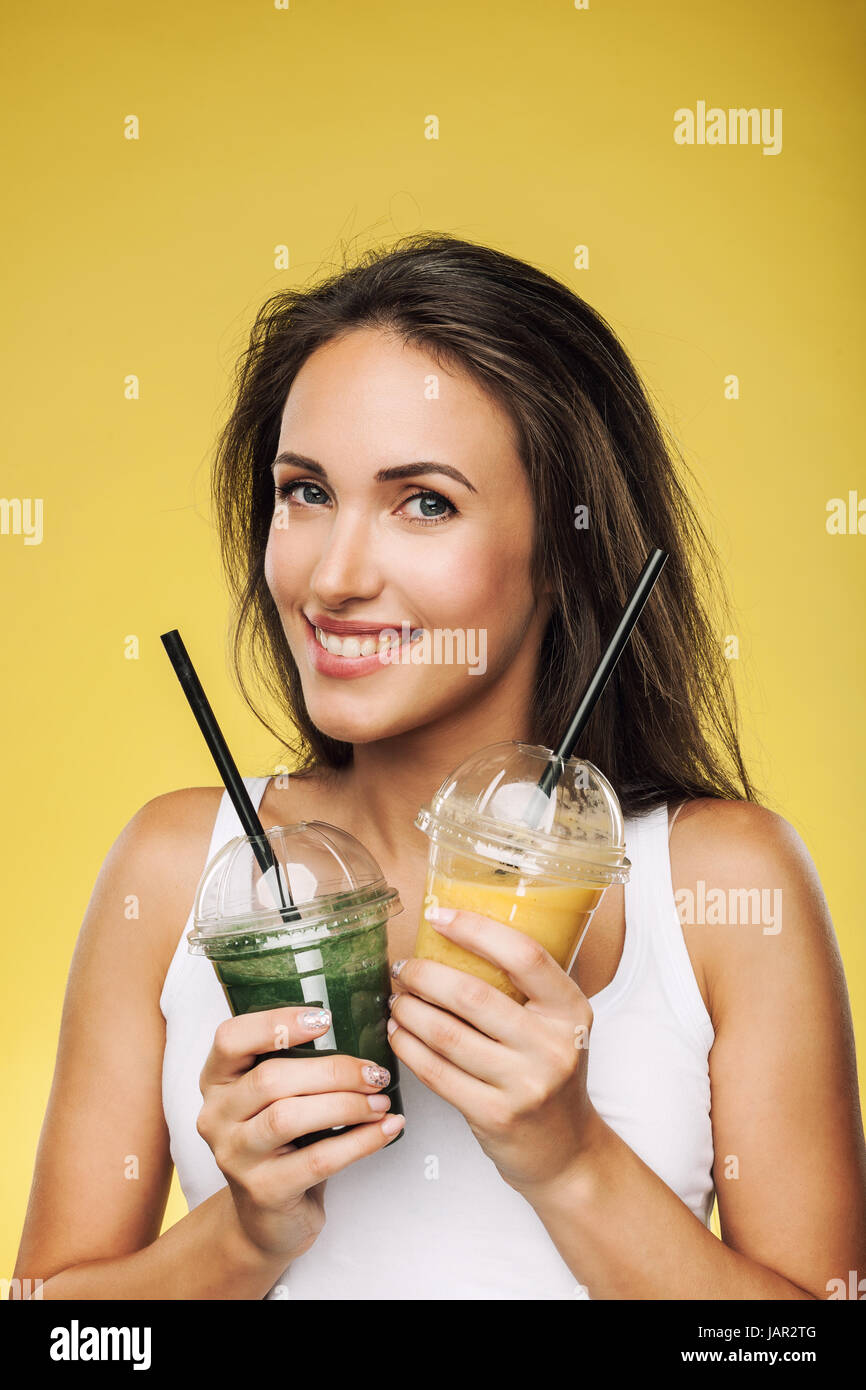 Woman with green smoothie Stock Photo Alamy