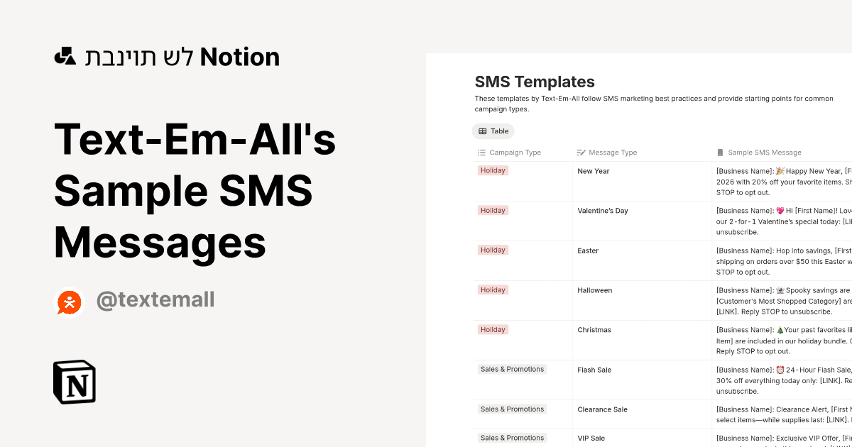 תבנית Text Em All #39 s Sample SMS Messages Marketplace של Notion
