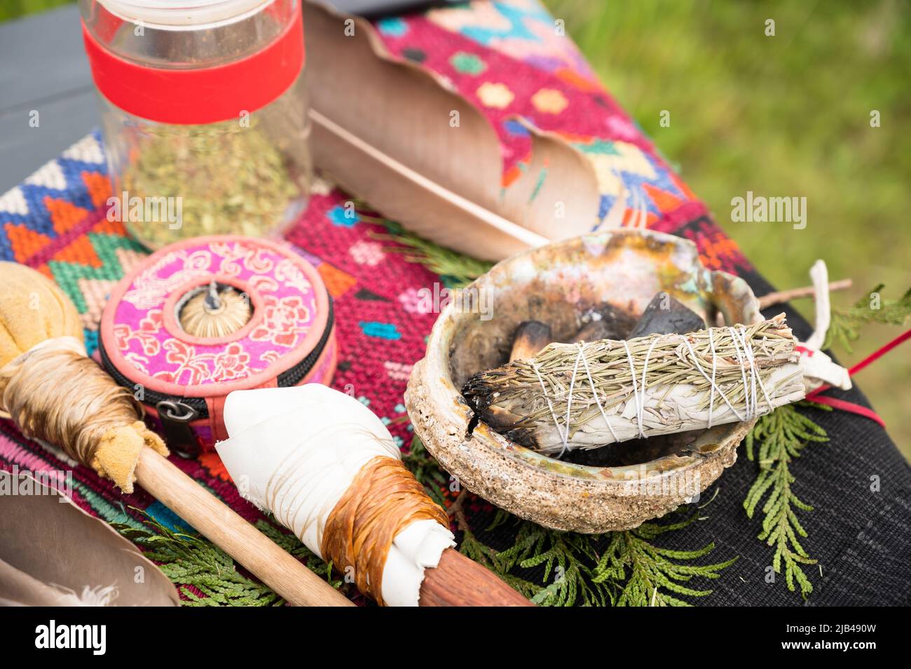 Native American Smudging Ceremony in Tribal Decorations Close Up on
