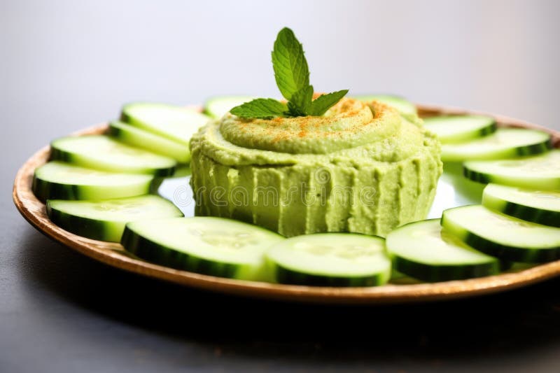 A cucumber dipped in hummus on a plate Premium AI generated image