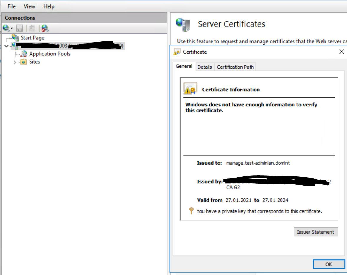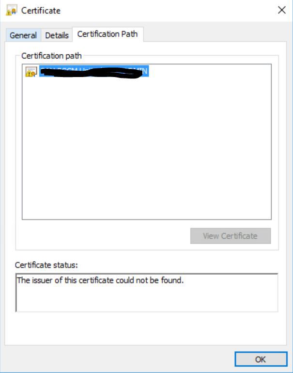 Certification Path in Certificates Snap in of mmc ok but in IIS