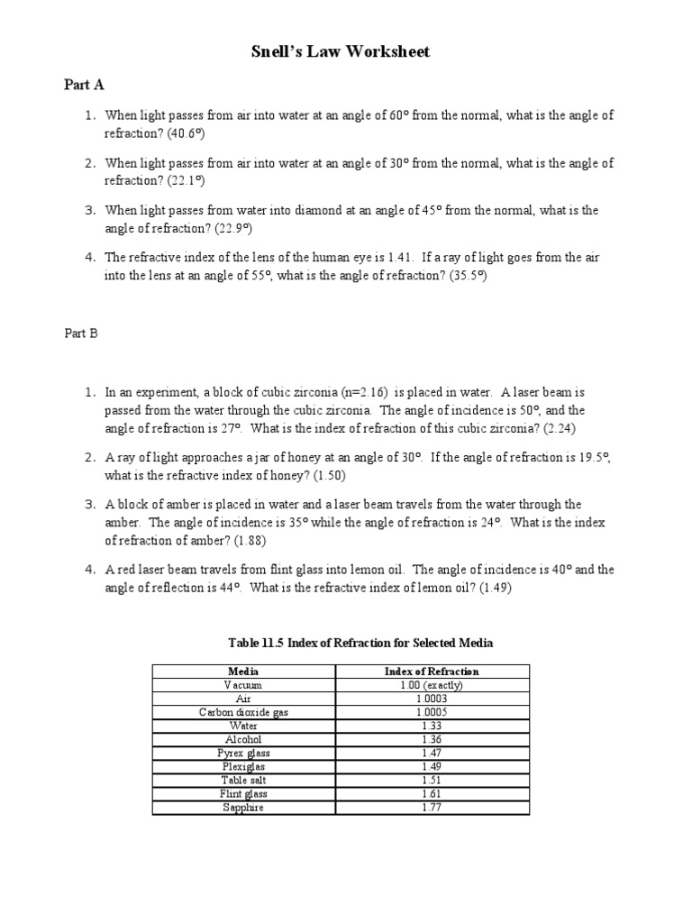 snells law worksheet answers
