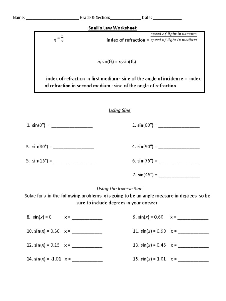 Snells Law Worksheet Printable And Enjoyable Learning