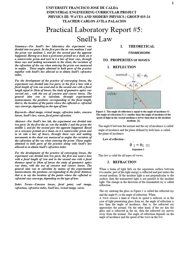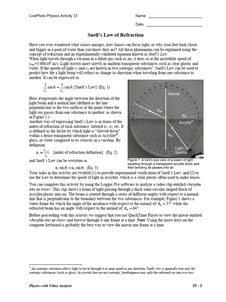 33 Snells Law Student PDF Refraction Refractive Index