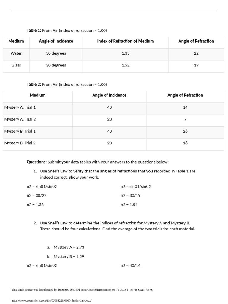 SOLUTION: Snell s law worksheet Studypool