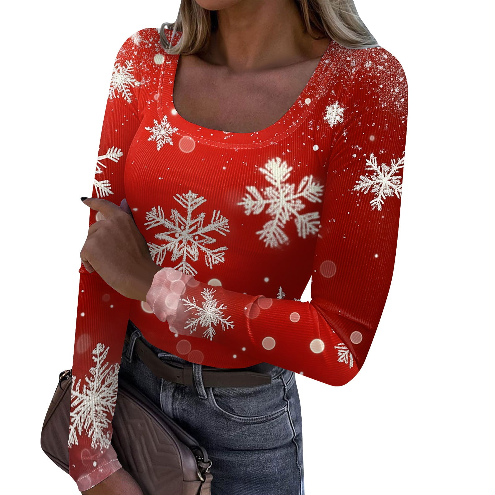 Christmas Womens Long Sleeve Shirts Funny Snowflake Pattern Scoop Neck