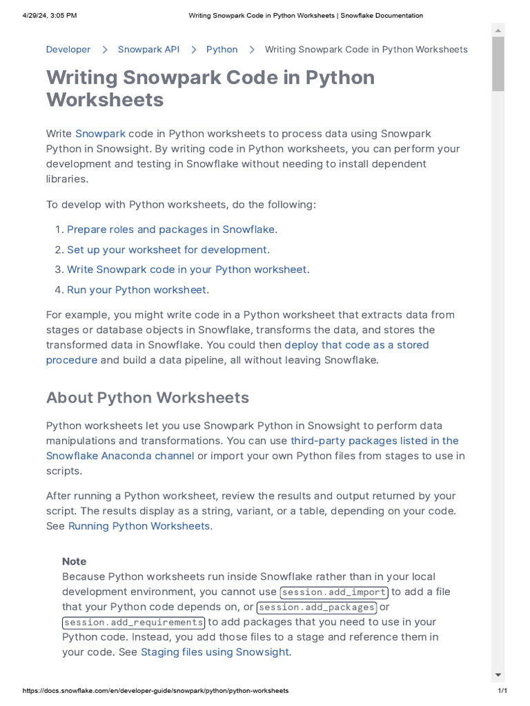 Writing Snowpark Code in Python Worksheets Snowflake Documentation PDF