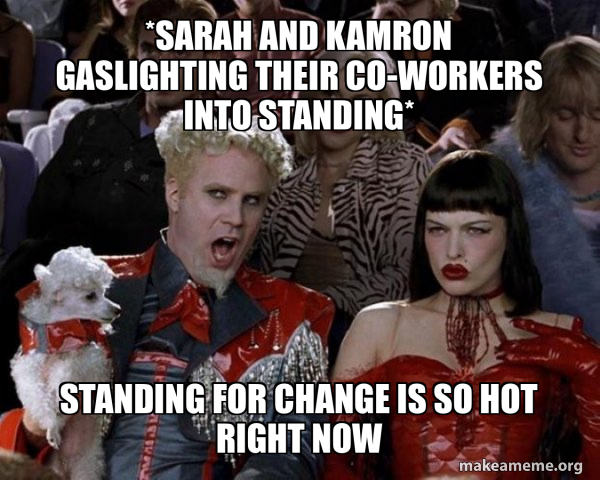 *Sarah and Kamron gaslighting their co workers into standing* Standing