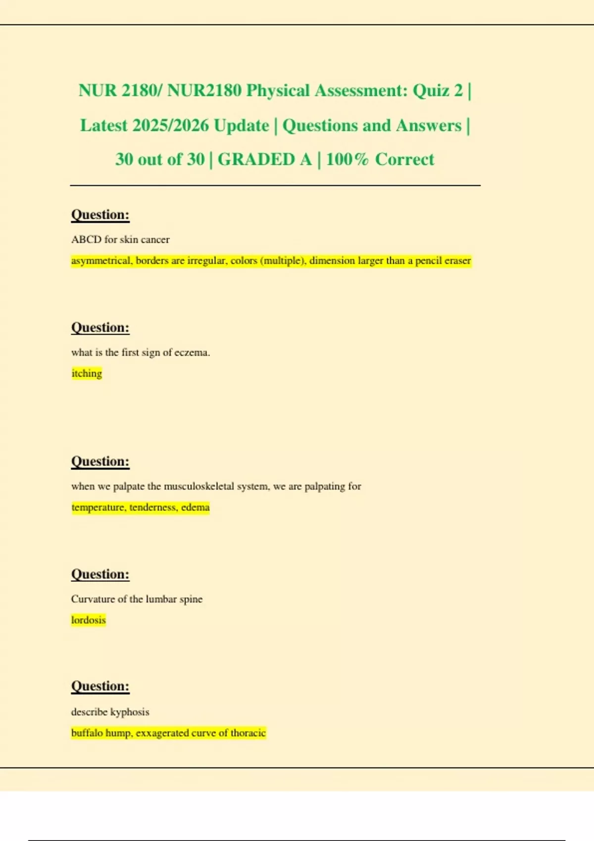NUR 2180/ NUR2180 Physical Assessment: Quiz 2 Latest 2025/2026 Update