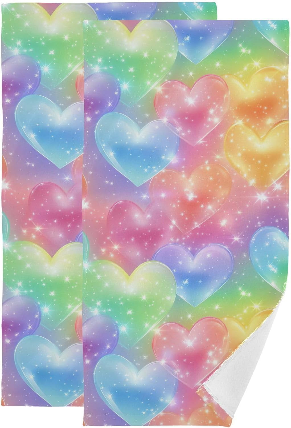 2 Piece Rainbow Colored Hearts Sparkling Lights Hand Towels Set Soft