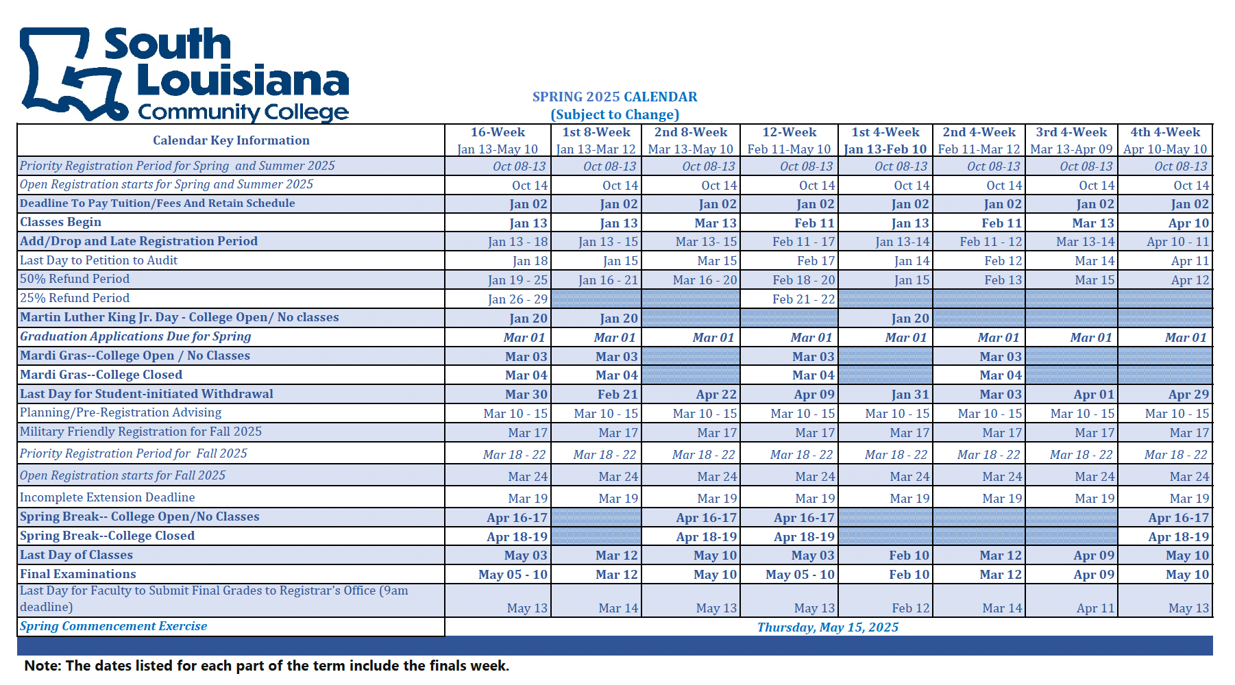 Academic Calendar South Louisiana Community College Acalog ACMS™
