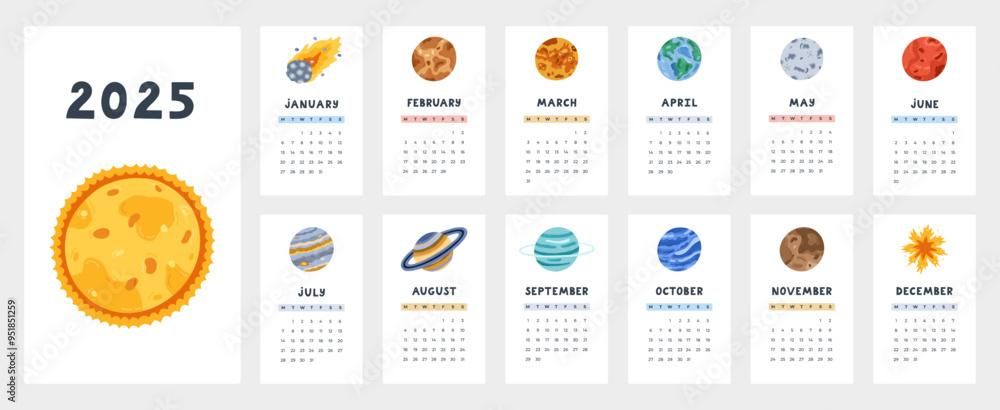 Cute calendar template for 2025 year with cartoon clipart of planets of