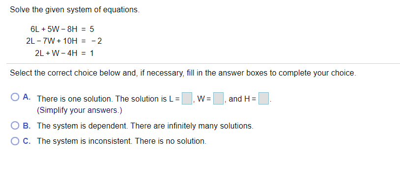 Solved Solve the given system of equations 6L 5W 8H = 5 Chegg com