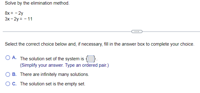 Solved Solve by the elimination method 8x=−2y3x−2y=−11 Chegg com
