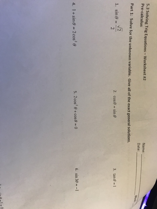 Trigonometric Equations: Part 1 Solving Trig Equations Worksheet