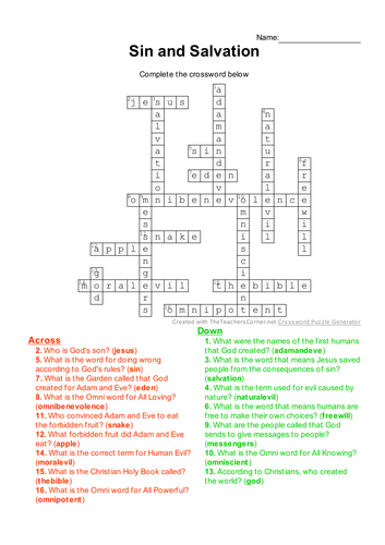 Sin and Salvation Crossword Religious Education Teaching Resources
