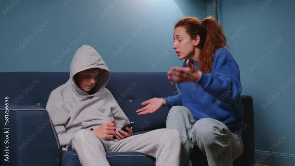 Mom screams and scolds her son in the room on the blue sofa Irritated