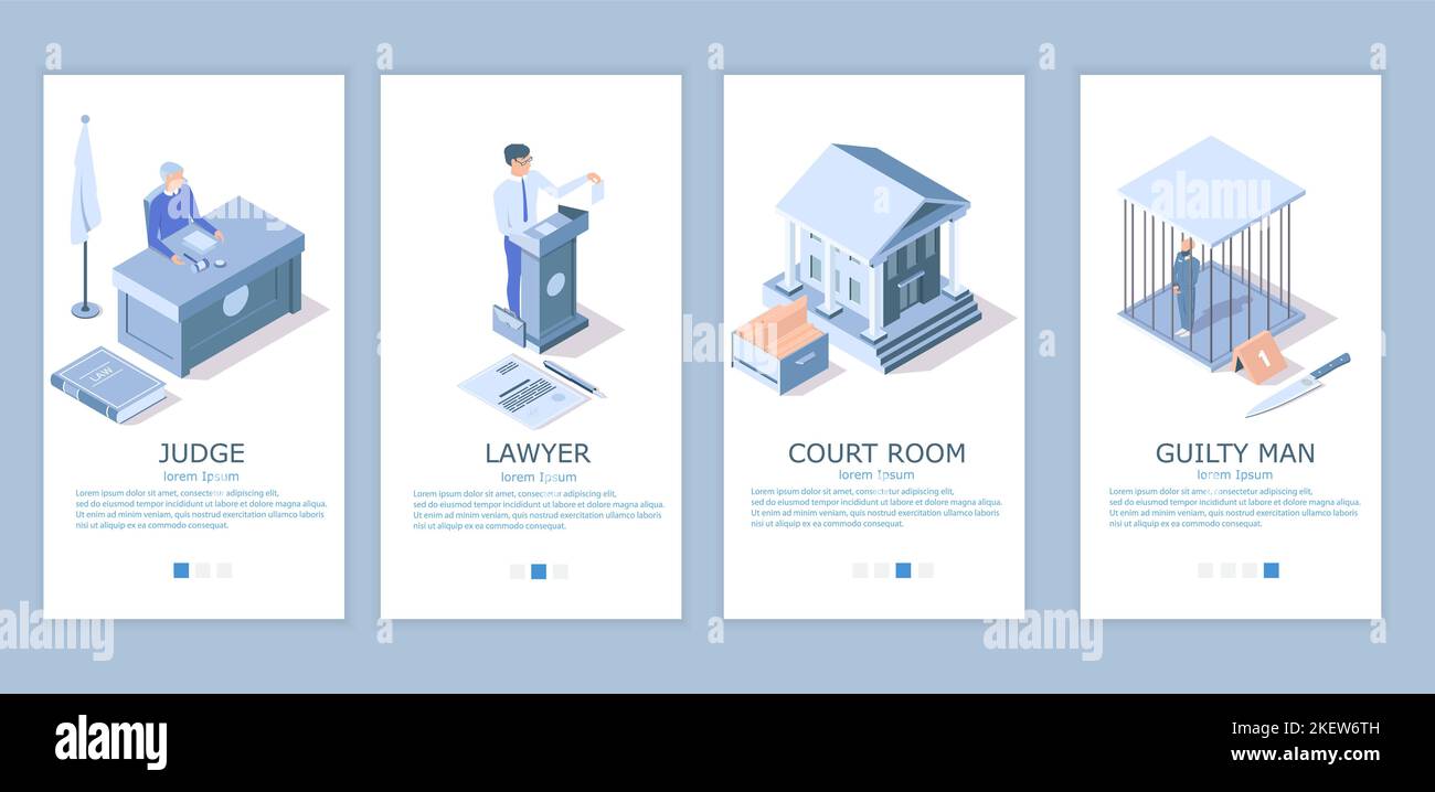 Judge Lawyer Court room Guilty man mobile app onboarding screens