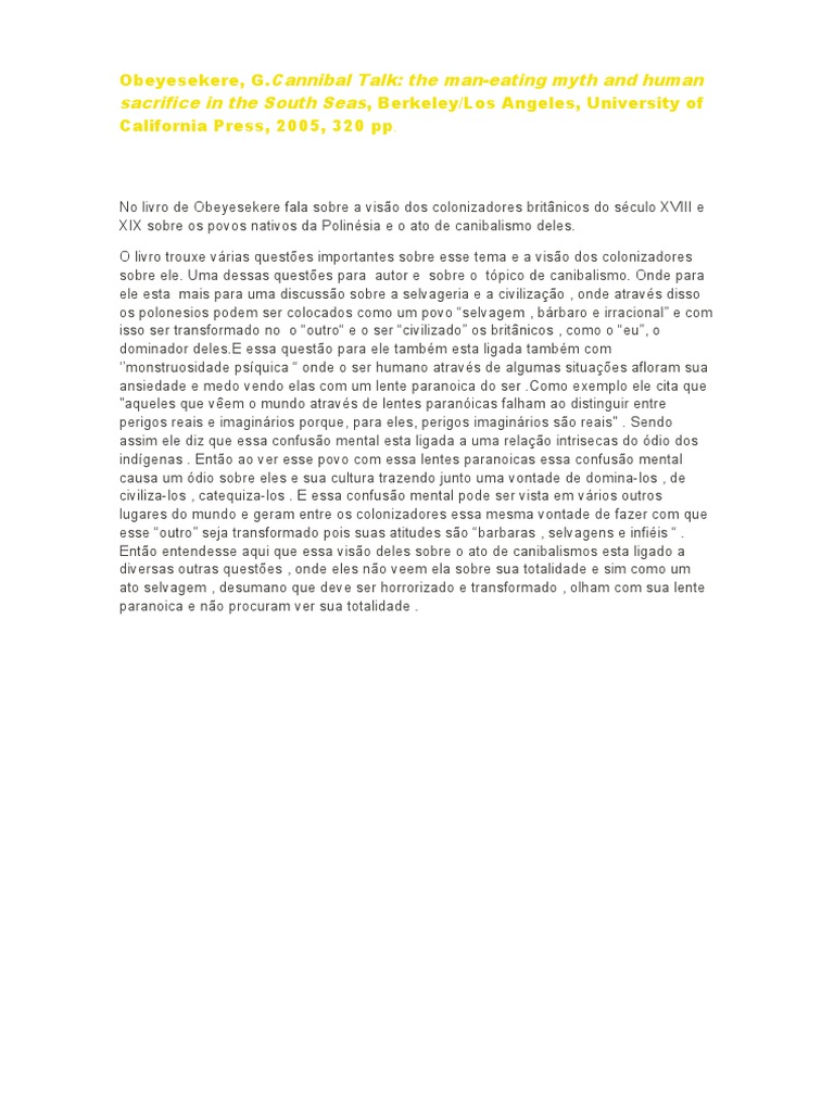 Resenha do livro Obeyesekere G Cannibal Talk the man eating myth and