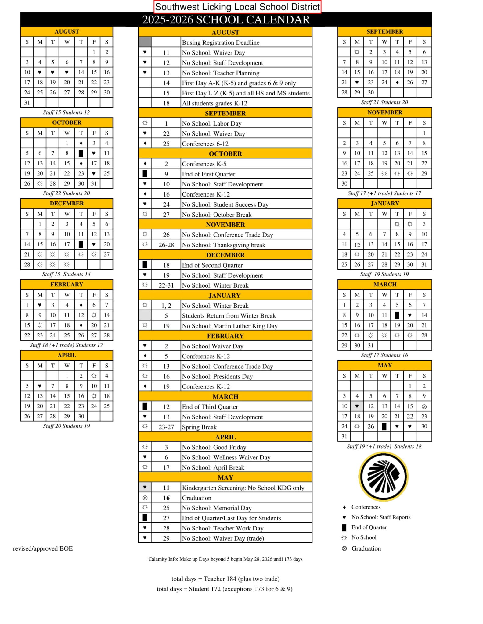 Southwest Licking Local School District 25 26 Calendar Revised EduCounty