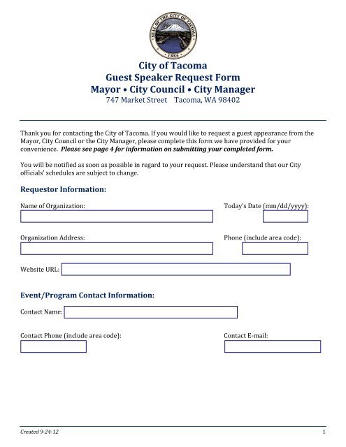 City of Tacoma Guest Speaker Request Form Mayor â ¢ City Council