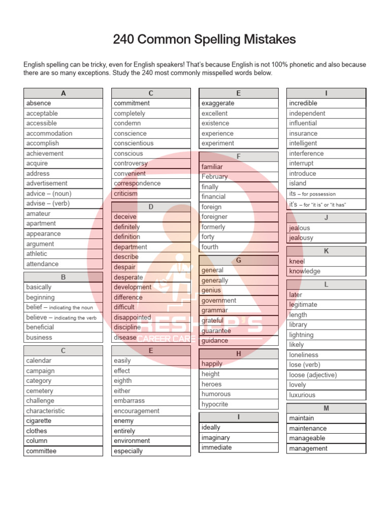 240 Common Spelling Mistakes PDF English Language Verb