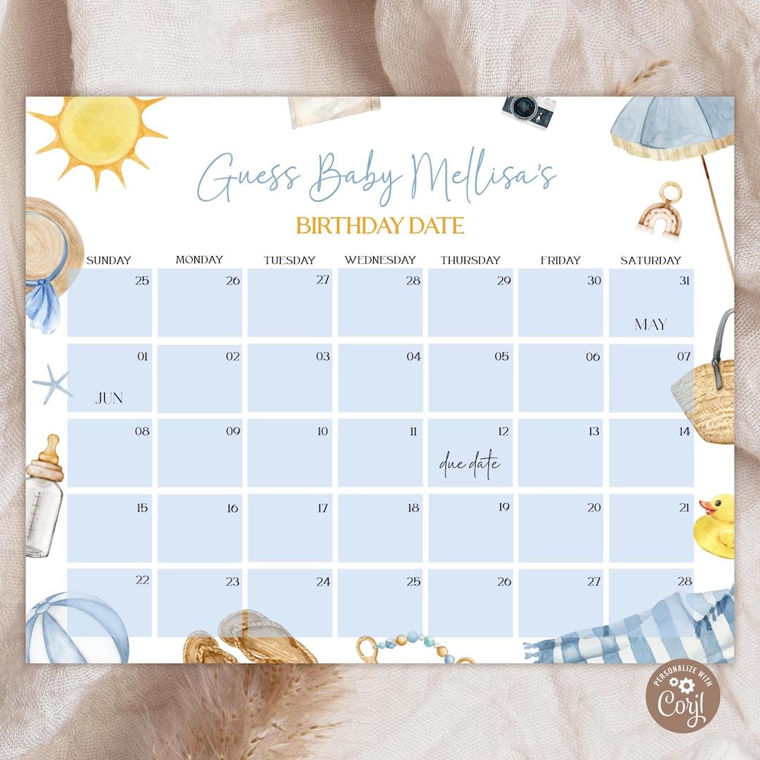 Editable Blue Beach Summer Baby Shower Due Date Calendar Boy Splish