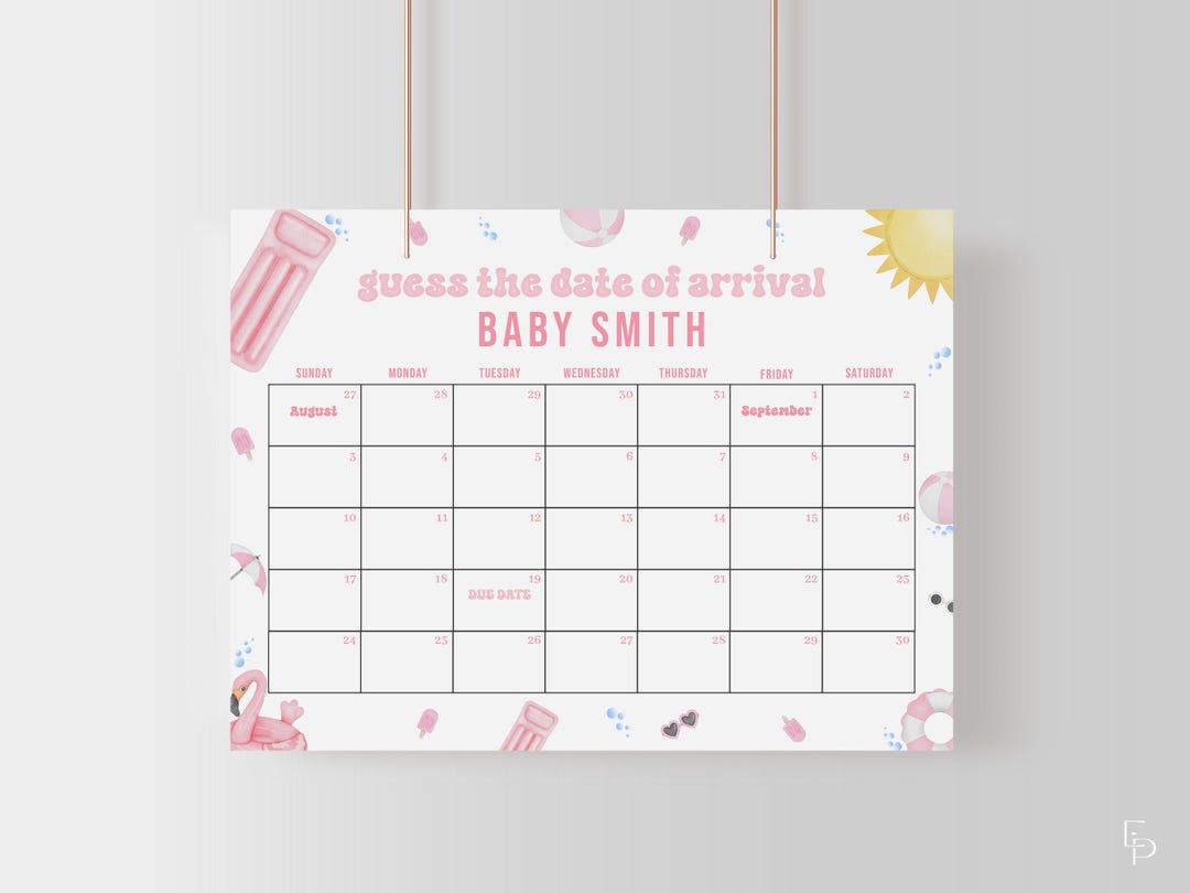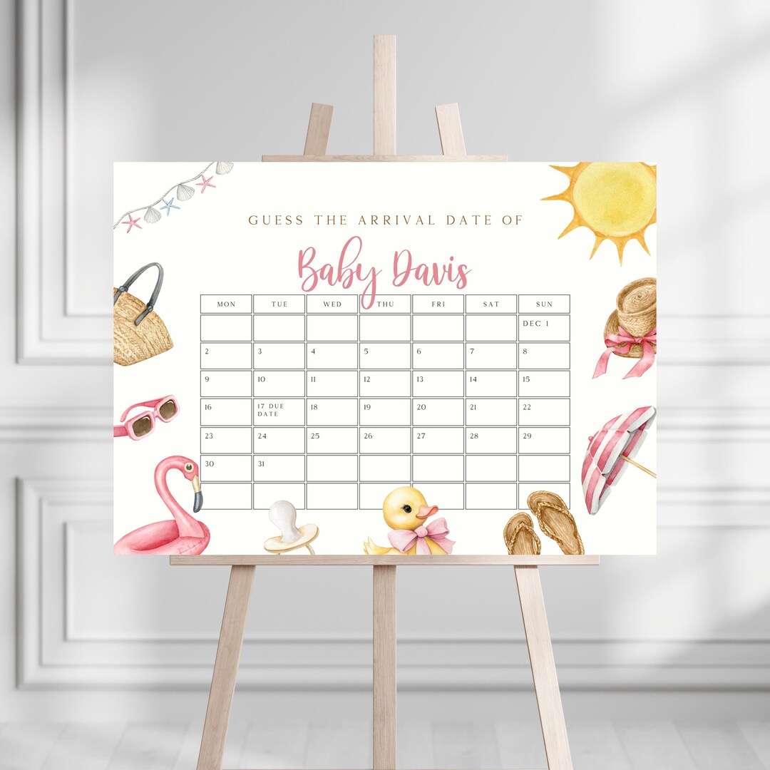 Splish Splash Baby Shower Due Date Calendar Editable Pink Girl Summer