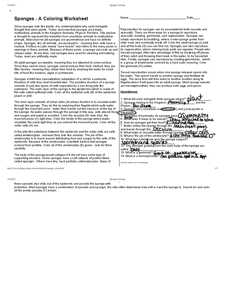Sponges Coloring Worksheet Key Questions A Coloring Pages