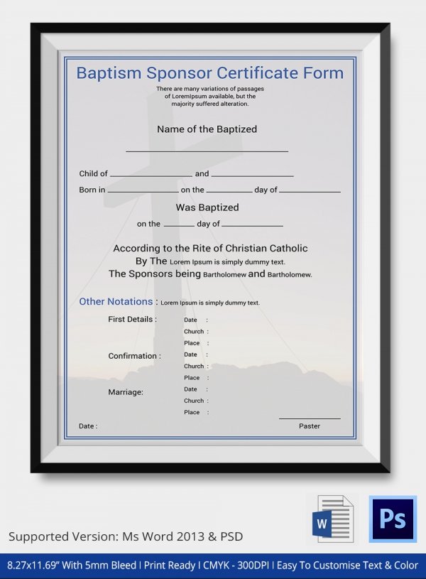 Baptism Sponsor Certificate Template in Adobe Photoshop Microsoft Word