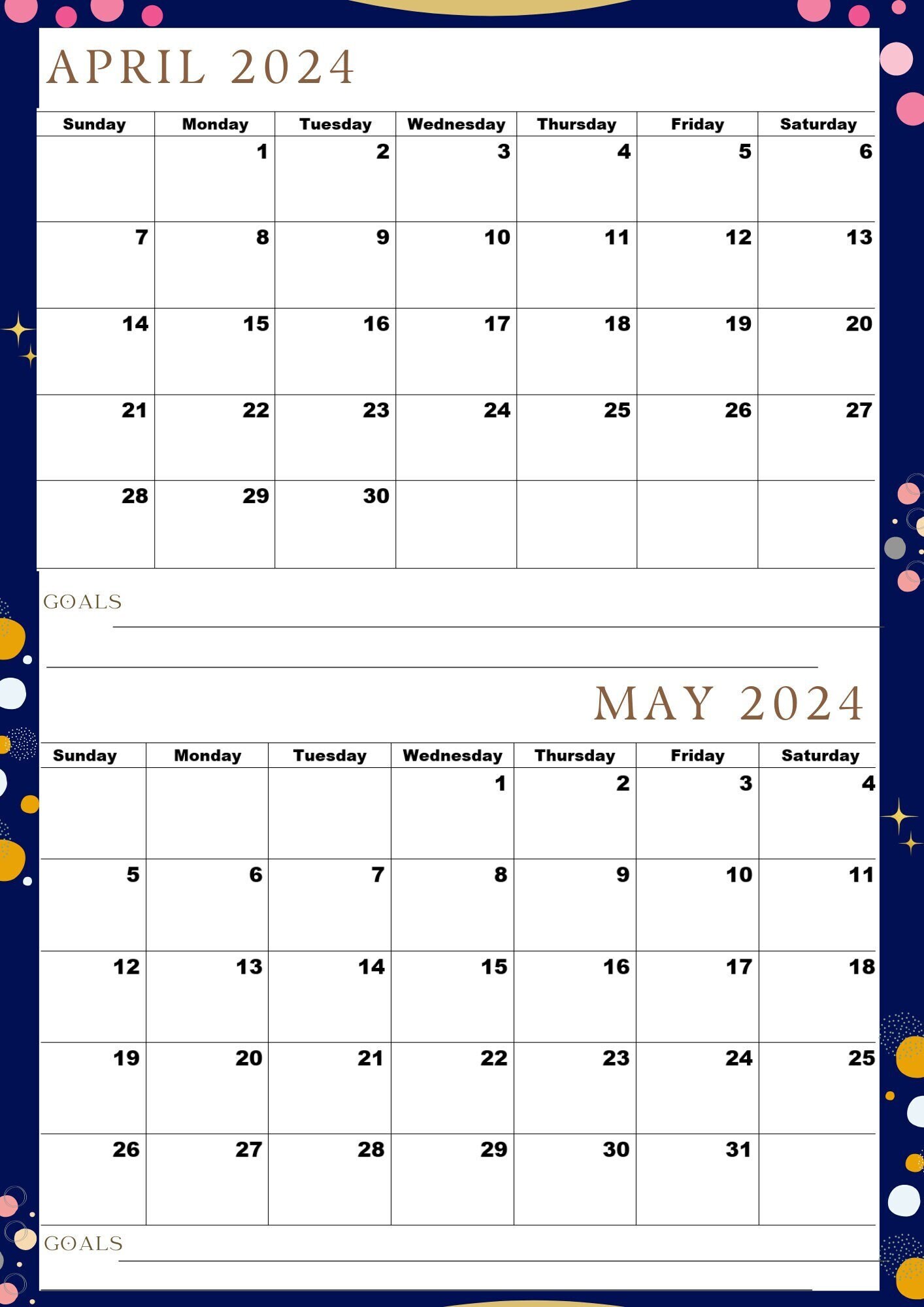 April 2024 Calendar May 2024 Calendar April May 2024 Calendar A4 size
