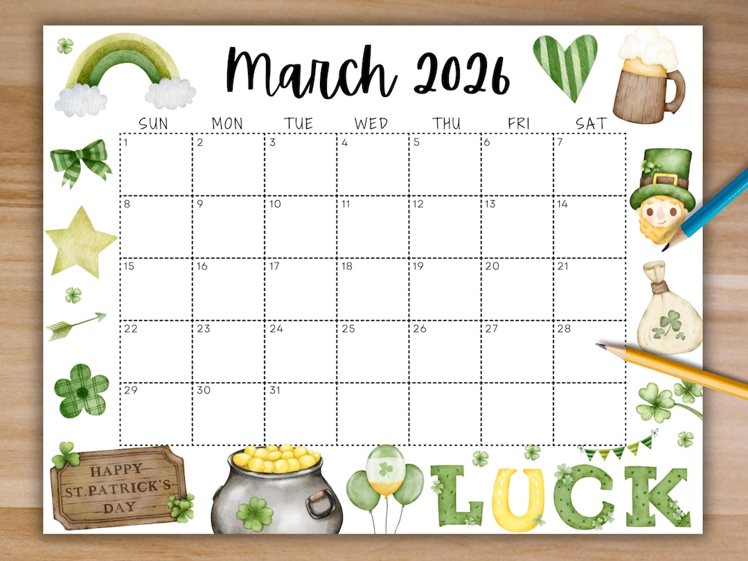 March 2026 Calendar Printable Editable St Patricks Day Monthly