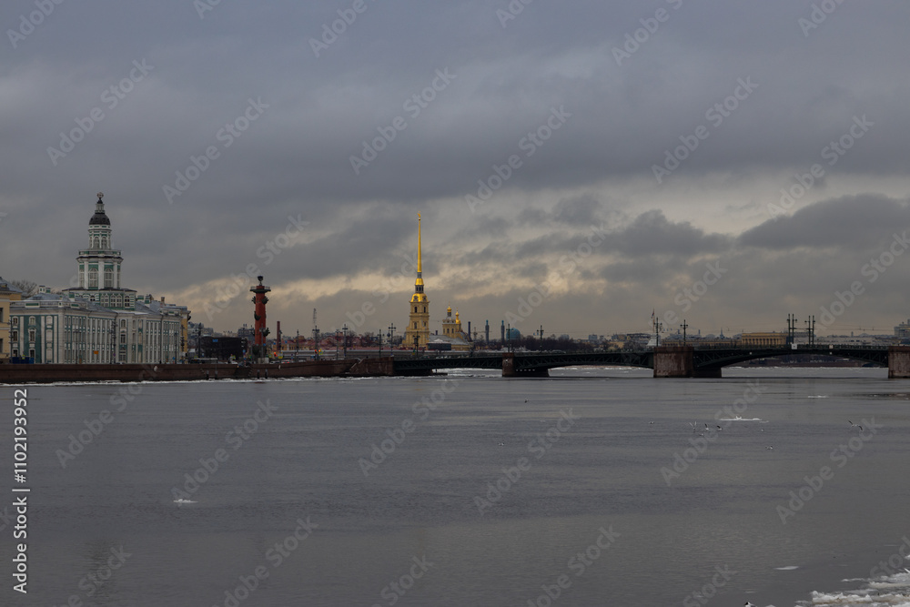 Gloomy clouds hover over the Neva River with the golden spire of Peter