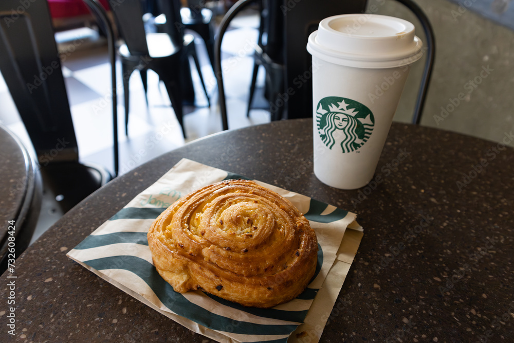 Starbucks Apple Pastry and Coffee Inside a Starbucks Cafe on June 16