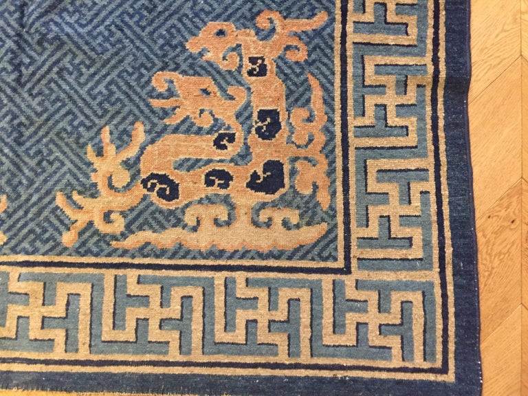19th Century Chinese Hand Knotted Rug Blu Beige with Stylized Spiritual