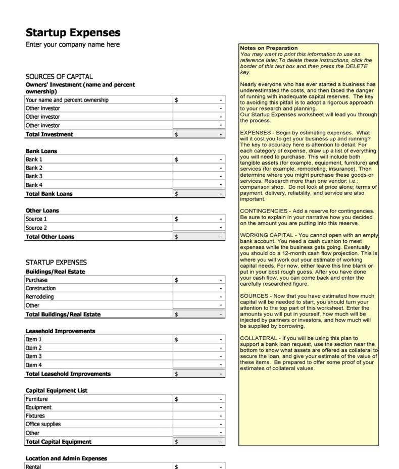 Sample Spreadsheet Business Startup Expenses Restaurant Small Business