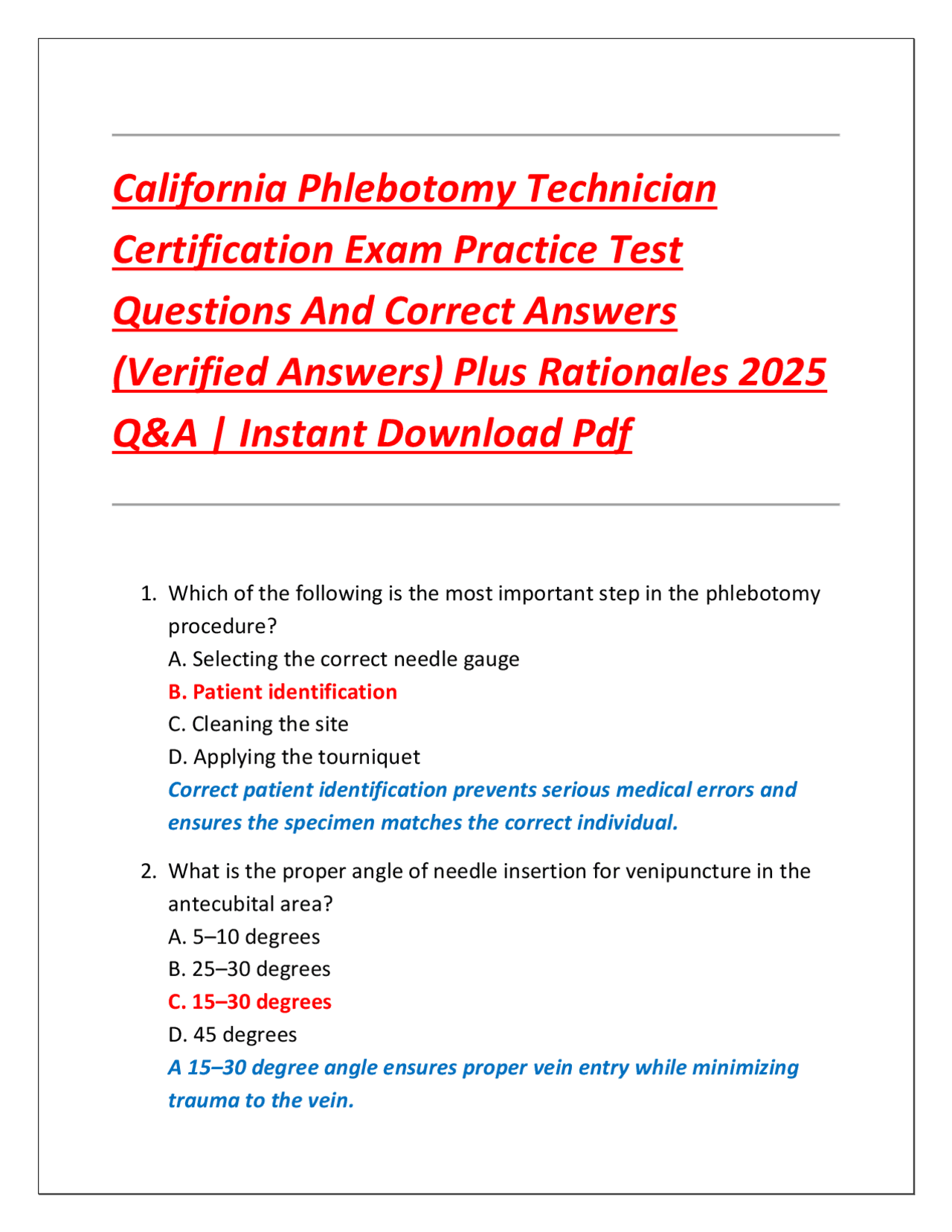 Phlebotomy Certification Exam With Correct Solution 2024 Phlebotomy