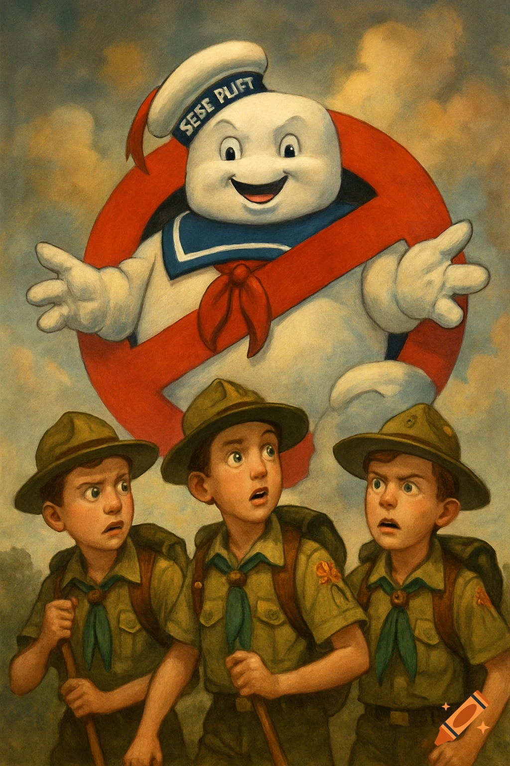 Ghostbusters logo with boy scouts and Stay Puft Marshmallow Man on Craiyon