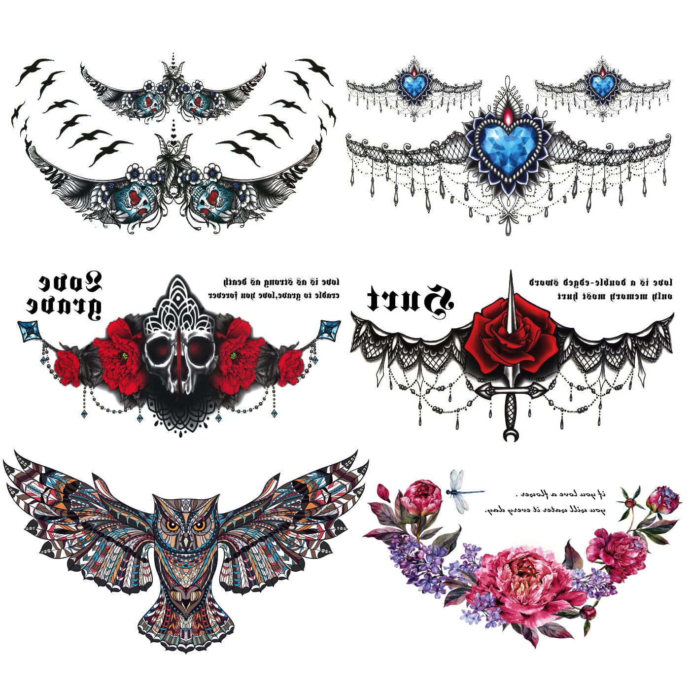 6 Sheets Sternum Tattoos For Women Jewelry Flower Owl Underboob