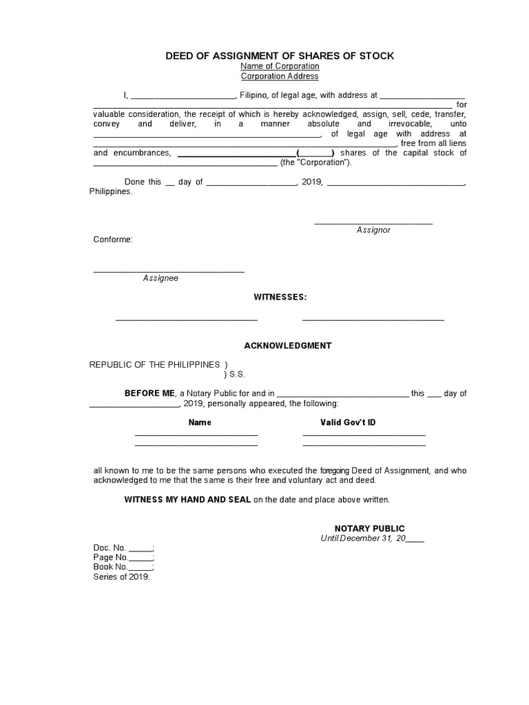 Deed of Assignment Shares of Stock PDF Assignment (Law) Natural