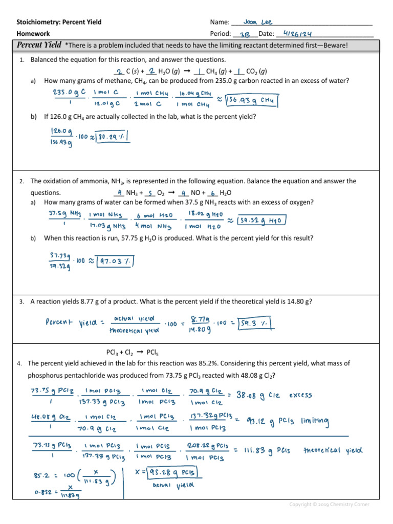 Stoichiometry and Percent Yield Practice Key CHEM 101 Studocu