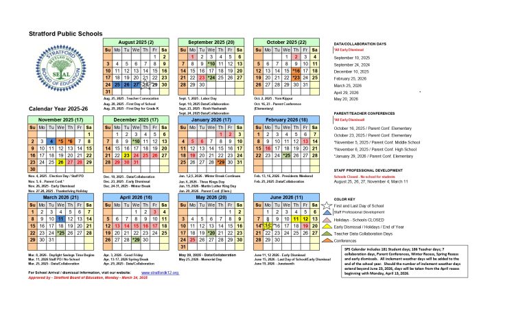 Stratford Public Schools Calendar 2025 2026 Academic Year