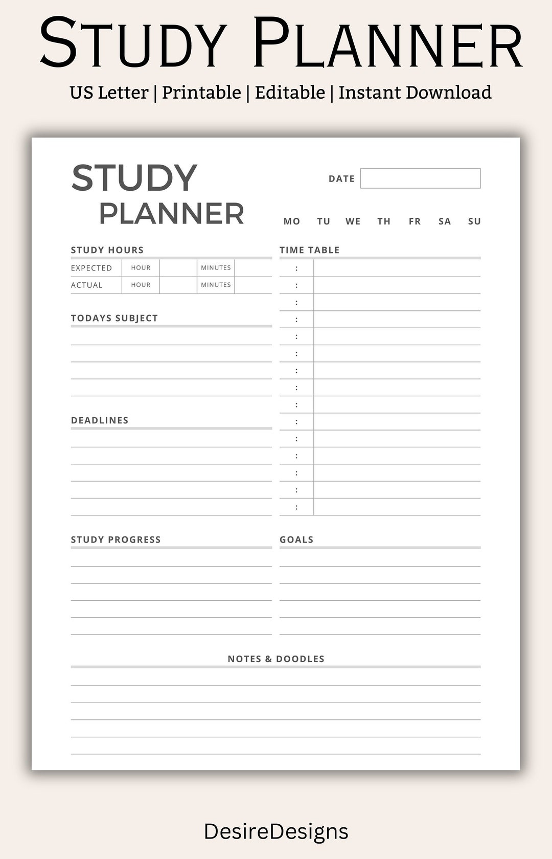 Study planner printable PDF student planner