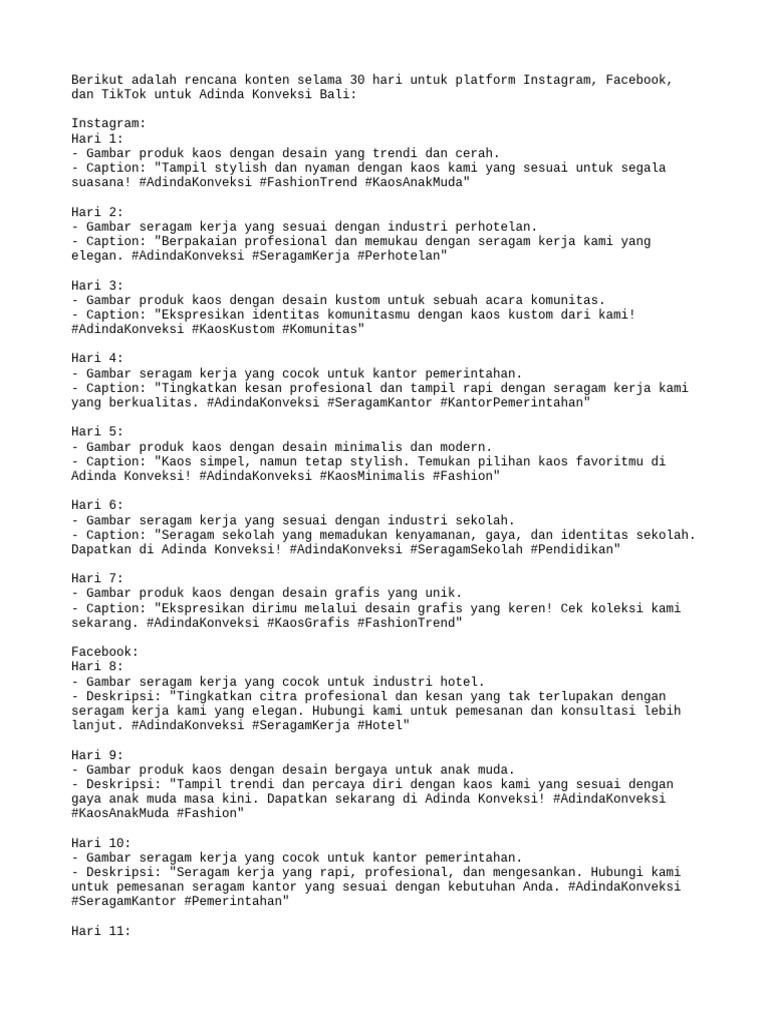 Contoh Konten Plan 1 Bulan Untuk IG FB Dan Tik Tok PDF