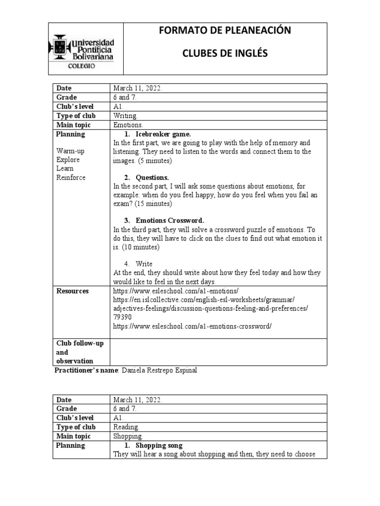 English Clubs Planning Daniela Restrepo Espinal PDF Crossword